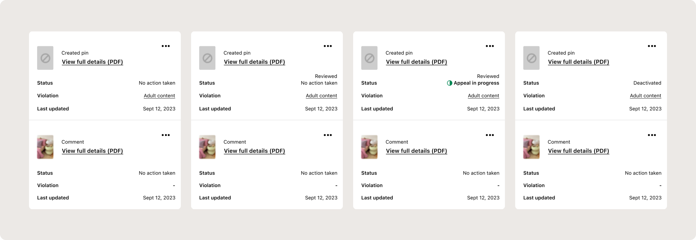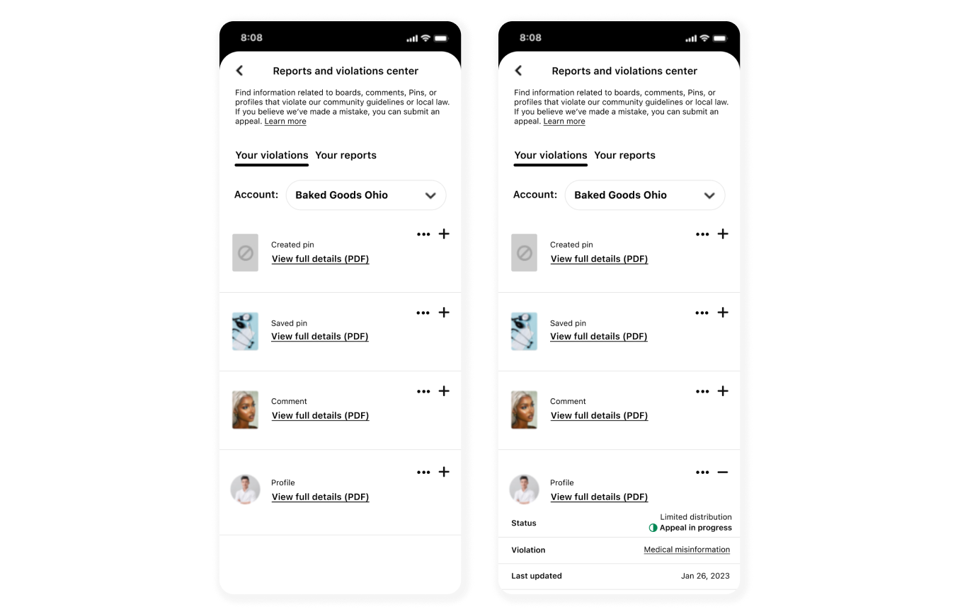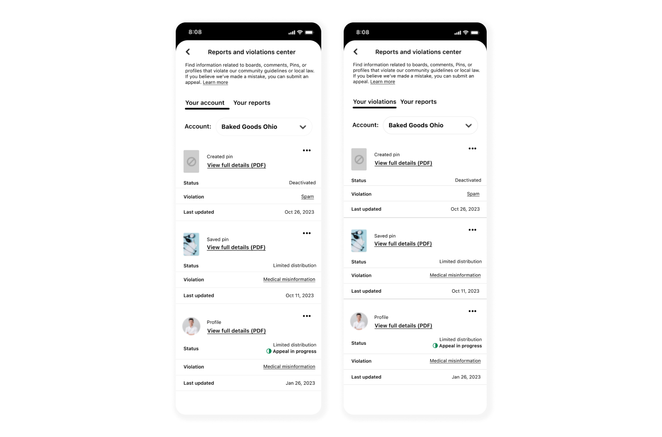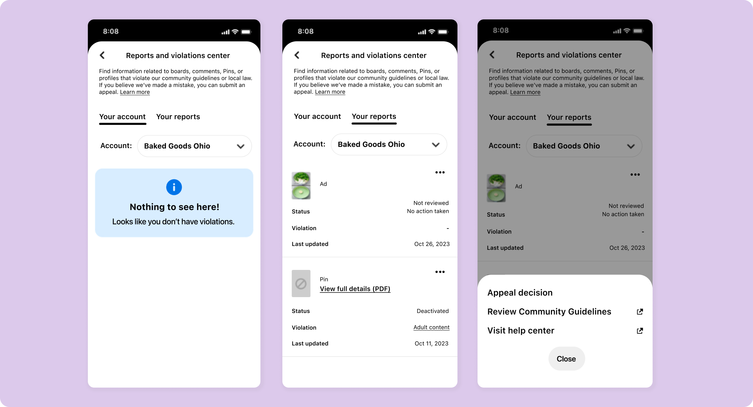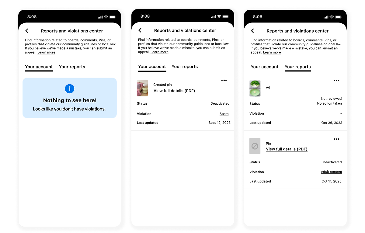 The Reports and Violations Center (RVC) enables Pinners to track the status of content they've reported, submit appeals, and view outcomes, supporting platform safety and giving users more transparency into how their reports are handled.